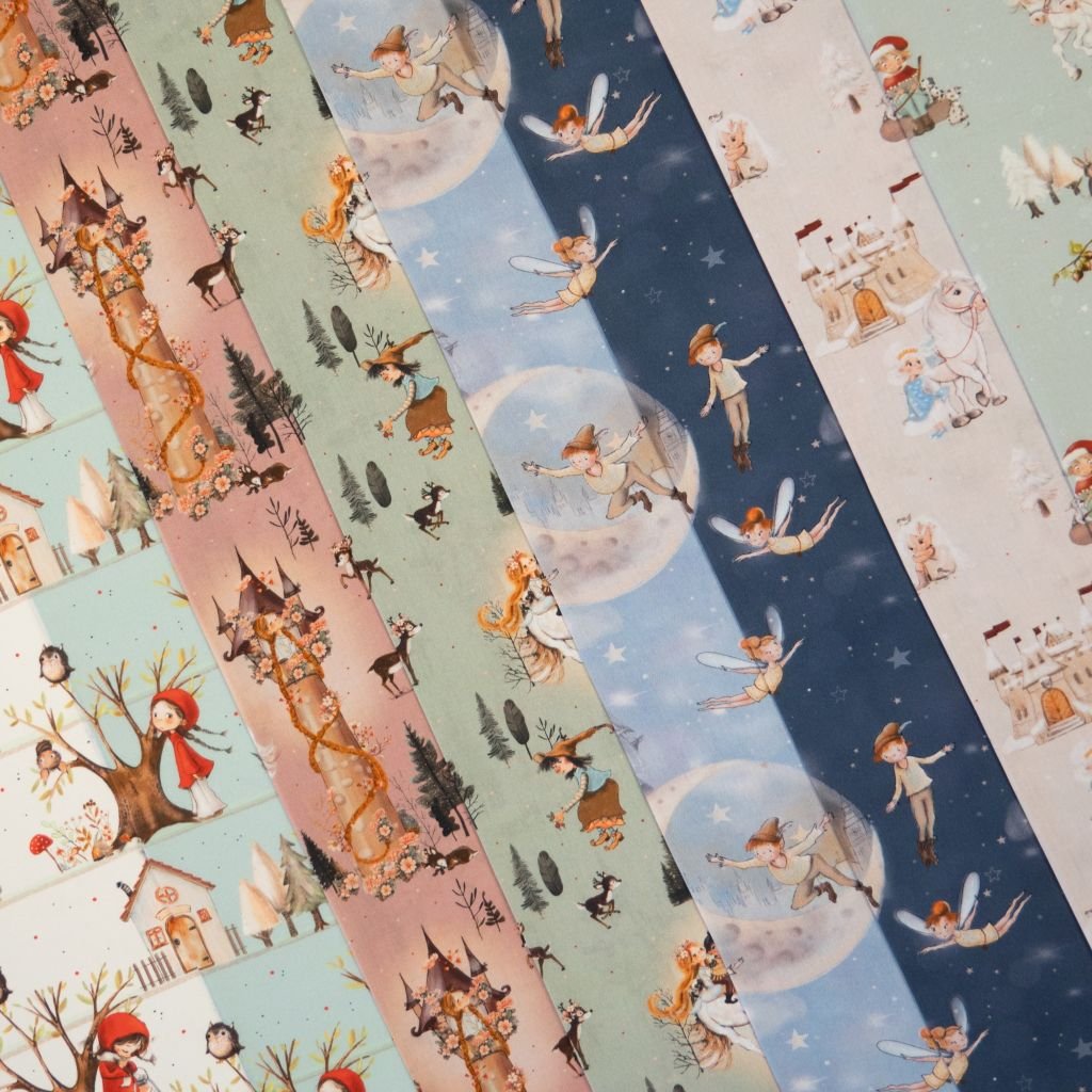 Tato kouzelná bavlněná látka z kolekce Fairy Tale přináší do světa šití oblíbené pohádkové postavy v hravém a stylovém provedení. Konkrétní vzor s motivem Petra Pana na džínově modrém podkladu okouzlí malé i velké snílky – jemné ilustrace známých scén dodávají látce jedinečný a nadčasový vzhled.