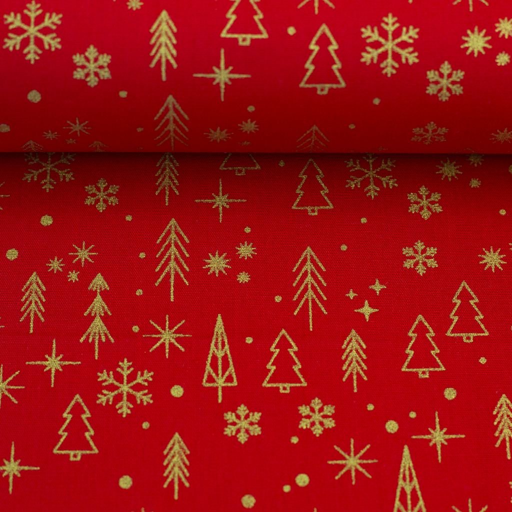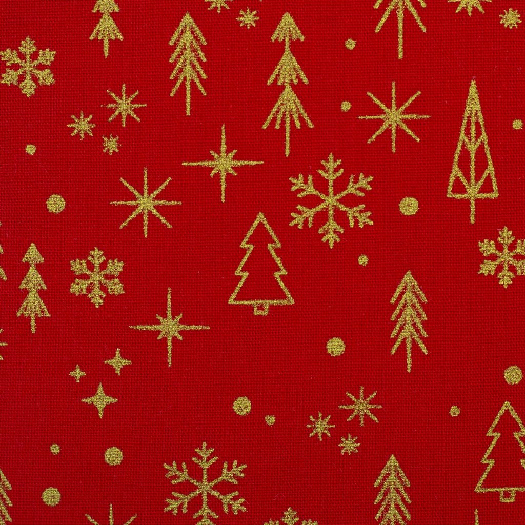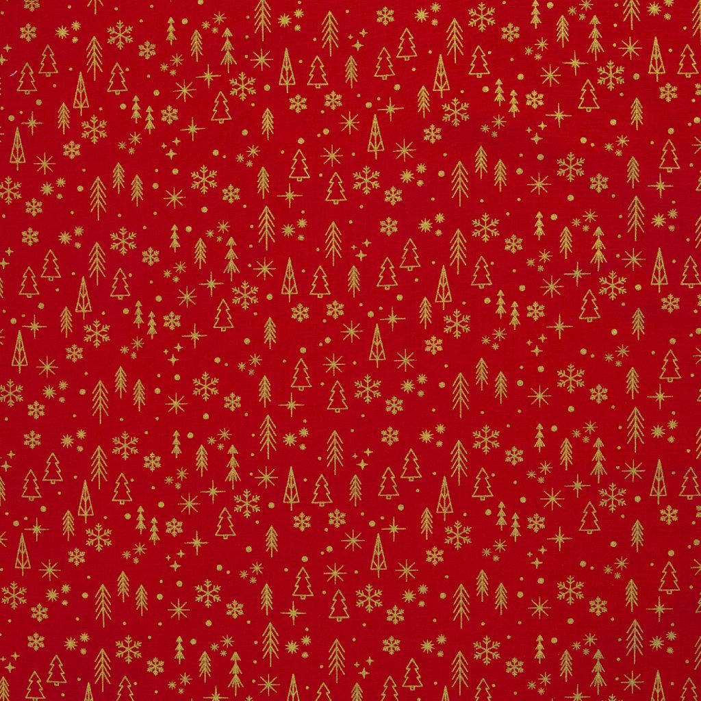 Tato vánoční látka z kolekce Neuss je vyrobena z kvalitní bavlny a zdobena jemným zlatým motivem na červeném podkladu. Elegantní design s vánočními motivy, jako jsou stromky, sněhové vločky a hvězdy, vytváří slavnostní a útulnou atmosféru. Ideální pro výrobu vánočních dekorací, ubrusů, povlaků, ozdob nebo oblečení s vánočním motivem. Látka je příjemná na dotek, prodyšná a šetrná k pokožce, skvělá pro kreativní vánoční projekty, které dodají vašemu domovu i šicímu projektu elegantní vánoční nádech.