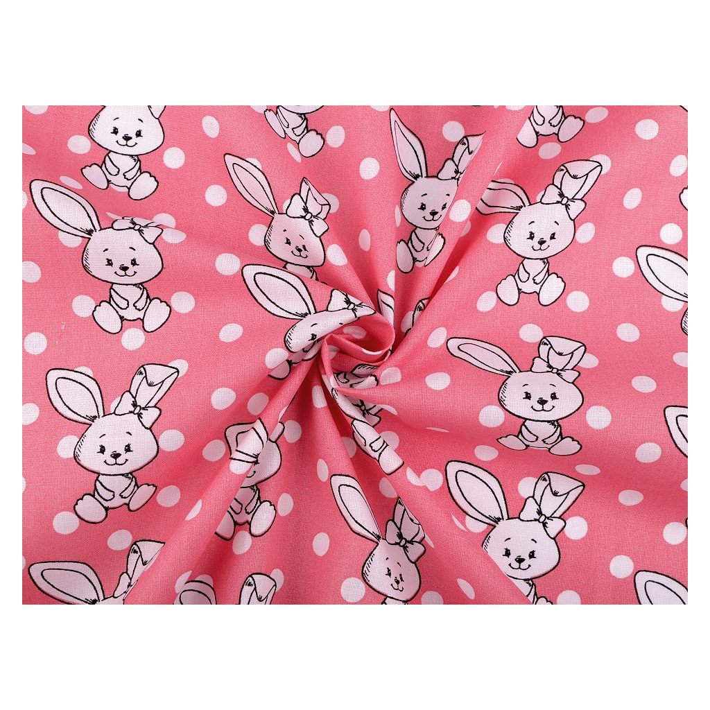 Bavlněná látka zaječice na světle růžové s puntíky. Složení: 100 % bavlna. Gramáž: 110 g/m². Šíře: 140 cm.Tuto látku doporučujeme, vzhledem k jejímu motivu, především na tvoření pro děti, povlečení, teepee stany, deky, hnízda, zavinovačky, usínáčky, hračky, závěsy, povlaky na polštáře.