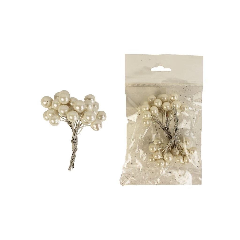 Bobule v perlově bílé barvě které jsou připevněné na drátky.