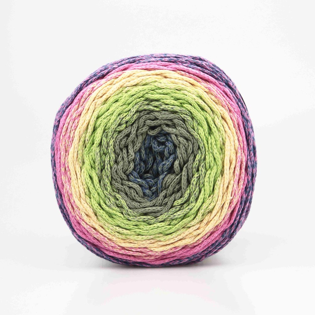 Chainy Cotton Cake je barevná samovzorovací "šňůrka" o průměru cca 2 mm (klubíčko v různých sytých a jemných odstínech, které v úpletu vytváří krásné barevné přechody a kombinace).