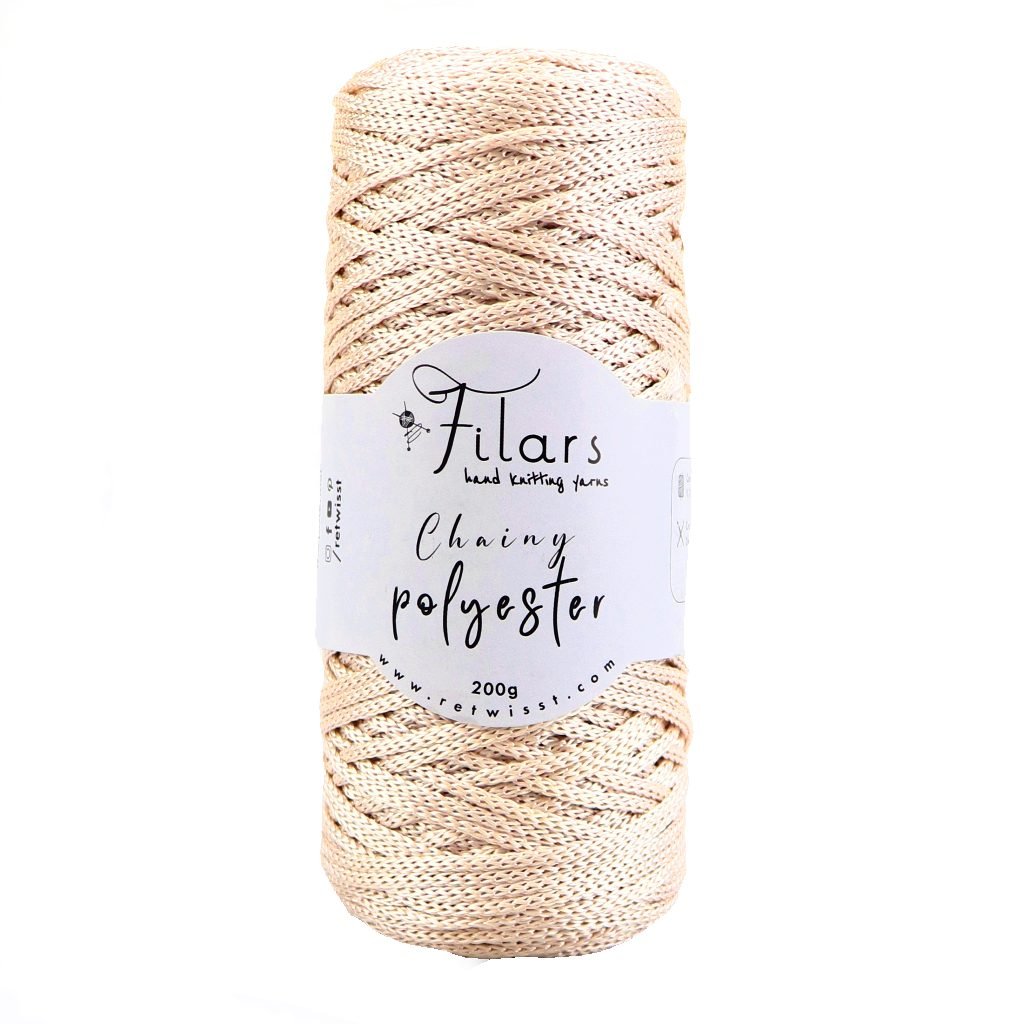 Polyesterová příze Chainy polyester je lesklá provázková příze, kterou využijete především k tvorbě kabelek, tašek, síťovek. batůžků, náramků, obalů na květináče, prostírání a dalších doplňků.