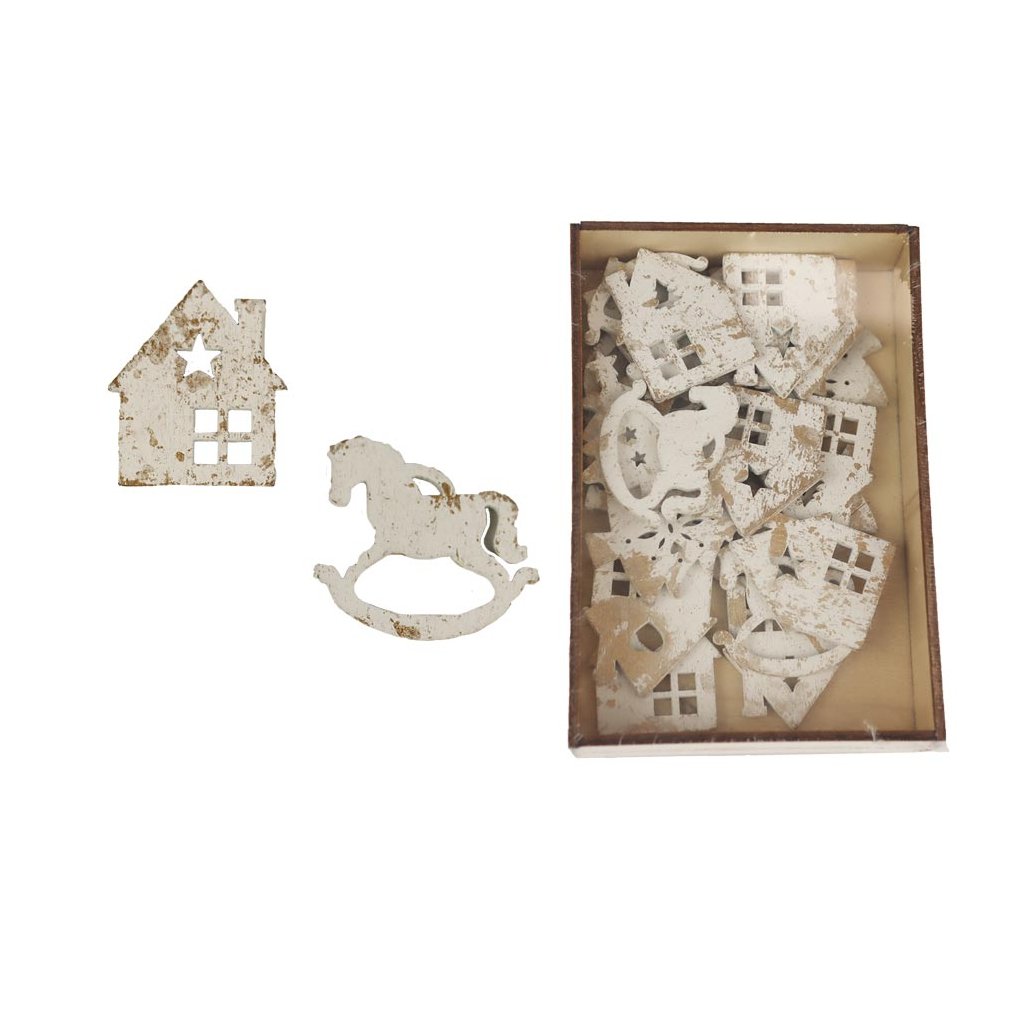 Sada vánočních přízdob ve vintage stylu obsahuje 24 dekorací ve tvaru domečku a houpacího koníku