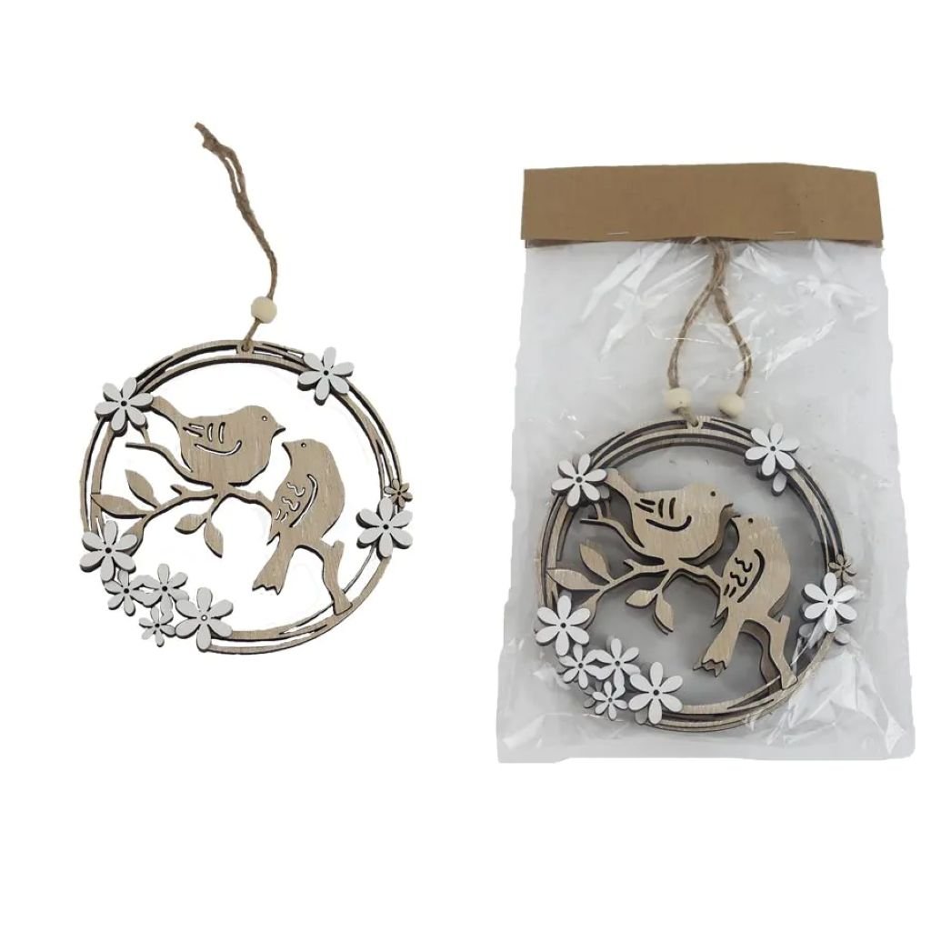 Dekorace s motivem ptáčků a květů je opatřen jutovým provázkem k zavěšení.