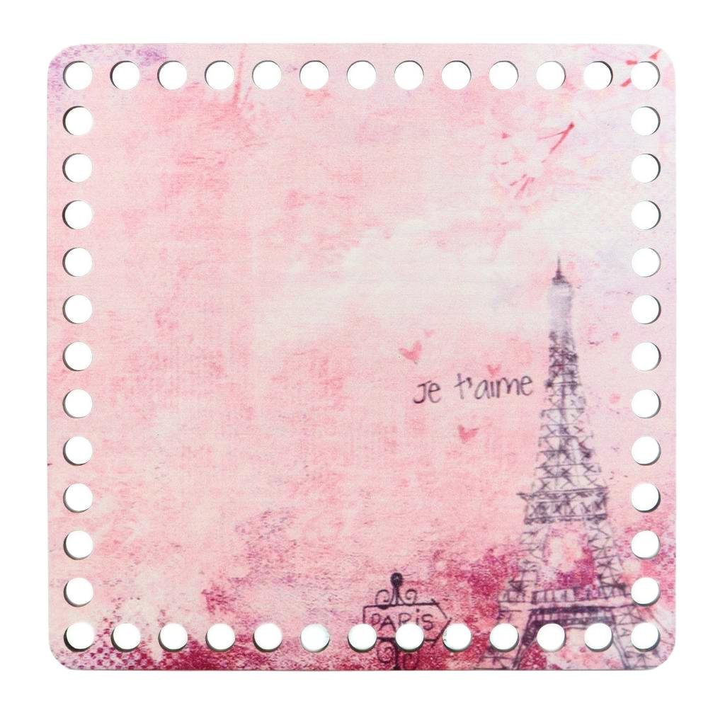 Dno na háčkovaný košík o rozměrech 20x20 cm ve vintage stylu je zdoben obrázkem Eiffelovy věže.