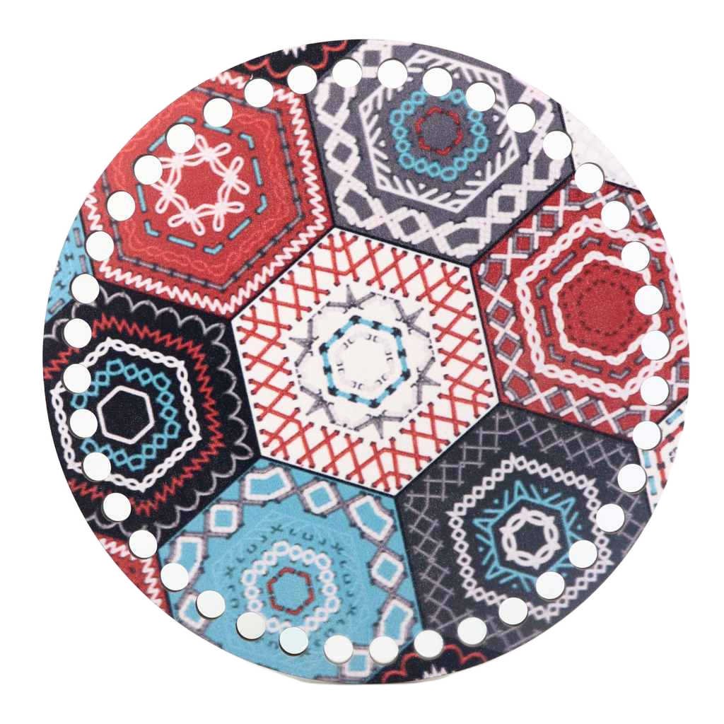 Dno na háčkovaný košík o průměru 20 cm je zdoben obrázkem připomínající patchwork.