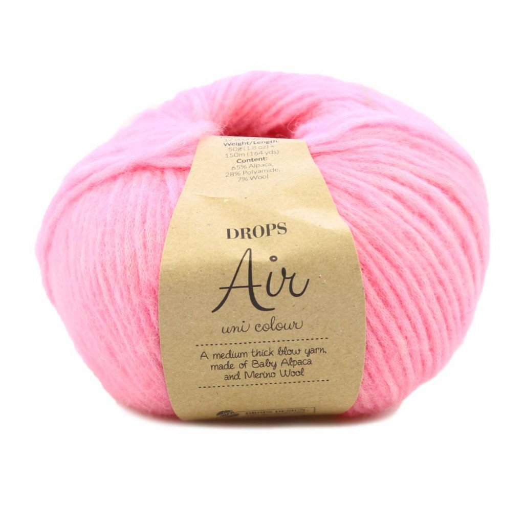 Drops Air je silná vzdušná příze ve složení jemná Baby Alpaka, Merino vlna a polyamid. Jedinečnost této příze je dána zpracováním, kdy jednotlivá vlákna nejsou tradičně skána, ale jsou vzduchem stlačena do dutinky. Díky tomu je výsledný úplet o 30 - 35 % lehčí než úplety z jiných, podobně silných přízí. Krásně vyniknou i plastické vzory.