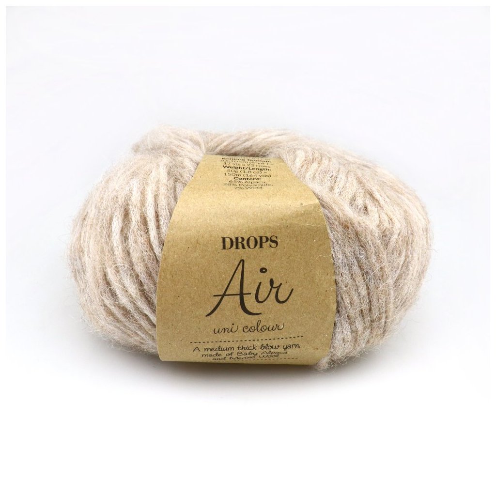 Drops Air je silná vzdušná příze ve složení jemná Baby Alpaka, Merino vlna a polyamid. Jedinečnost této příze je dána zpracováním, kdy jednotlivá vlákna nejsou tradičně skána, ale jsou vzduchem stlačena do dutinky. Díky tomu je výsledný úplet o 30 - 35 % lehčí než úplety z jiných, podobně silných přízí. Krásně vyniknou i plastické vzory.