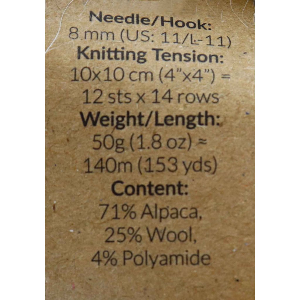 Ingredients:71% alpaca, 25% wool, 4% polyamide