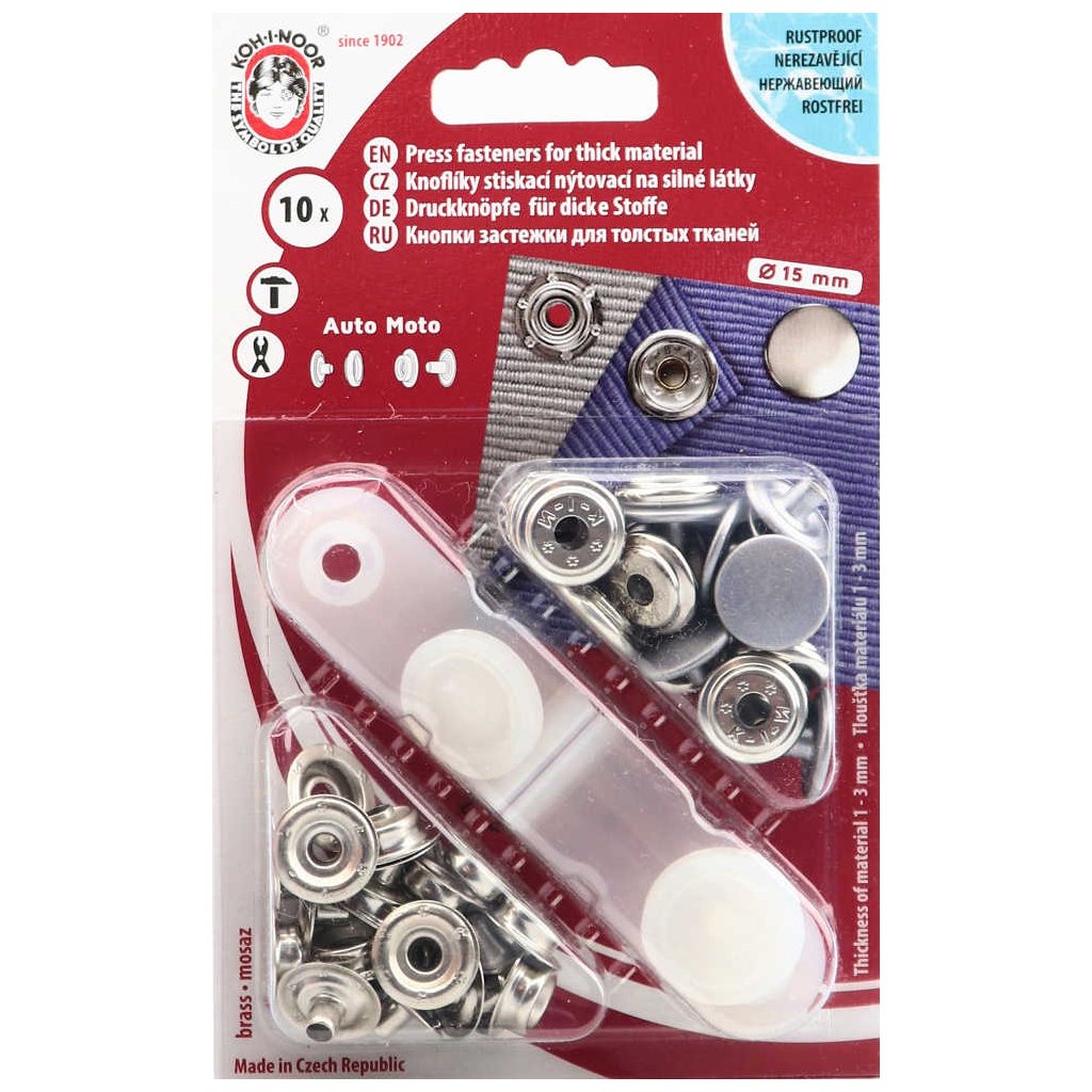 AUTO-MOTO rivet buttons, 15 mm diameter, are suitable for joining thicker fabrics.