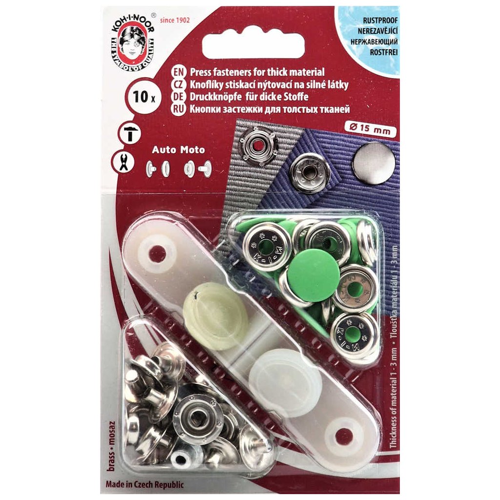 AUTO-MOTO rivet buttons, 15 mm diameter, are suitable for joining thicker fabrics.