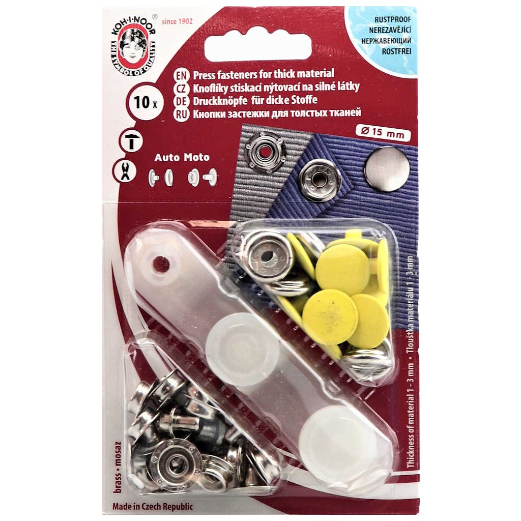 AUTO-MOTO rivet buttons, 15 mm diameter, are suitable for joining thicker fabrics.