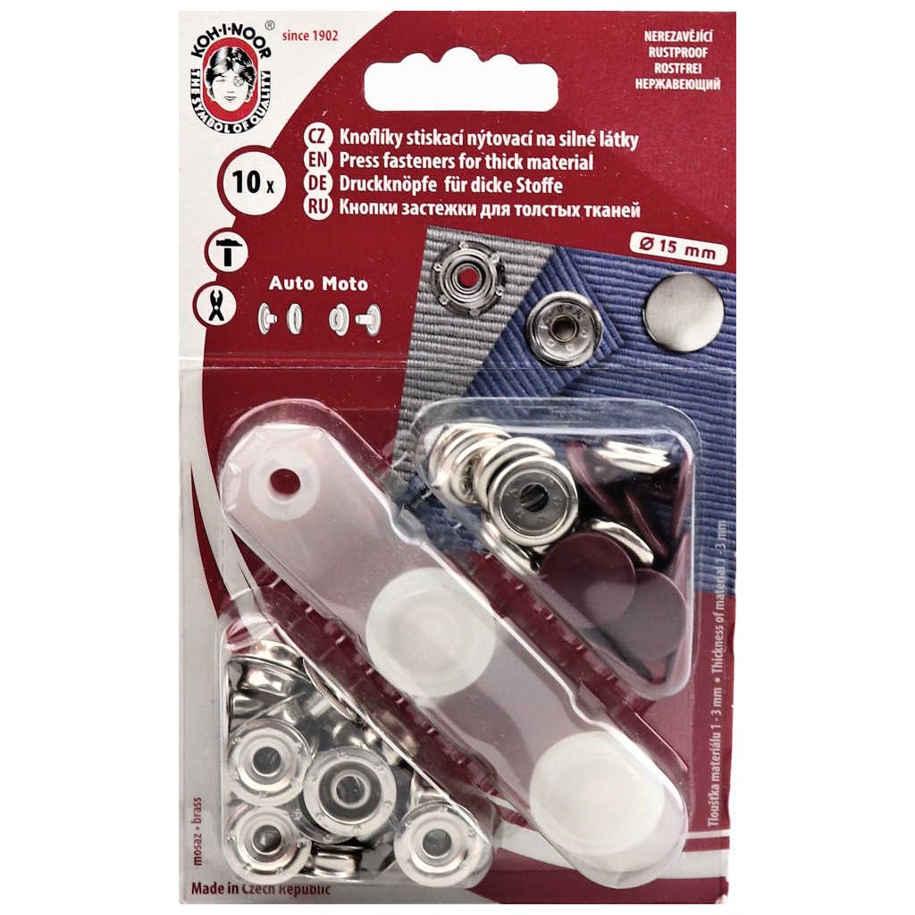 AUTO-MOTO rivet buttons, 15 mm diameter, are suitable for joining thicker fabrics.