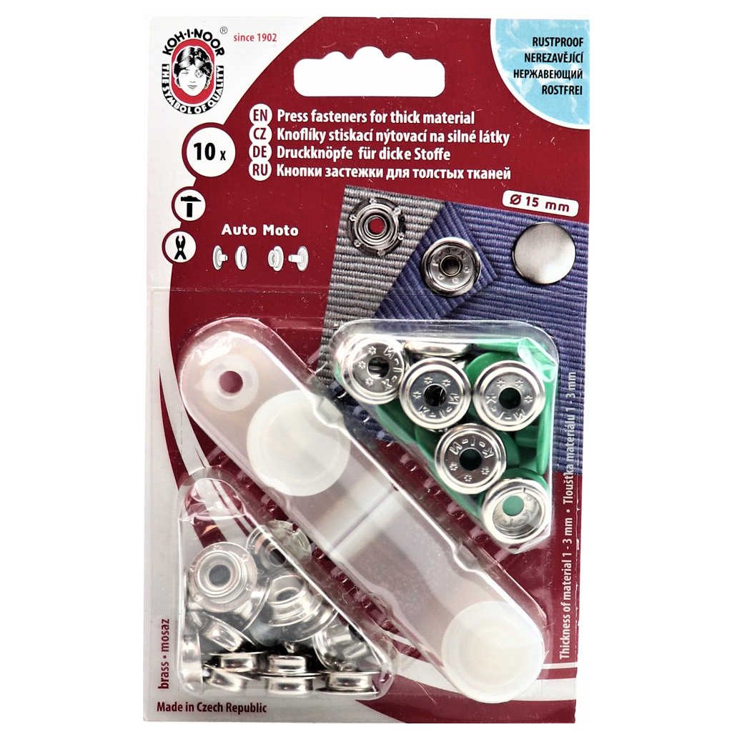 AUTO-MOTO rivet buttons, 15 mm diameter, are suitable for joining thicker fabrics.