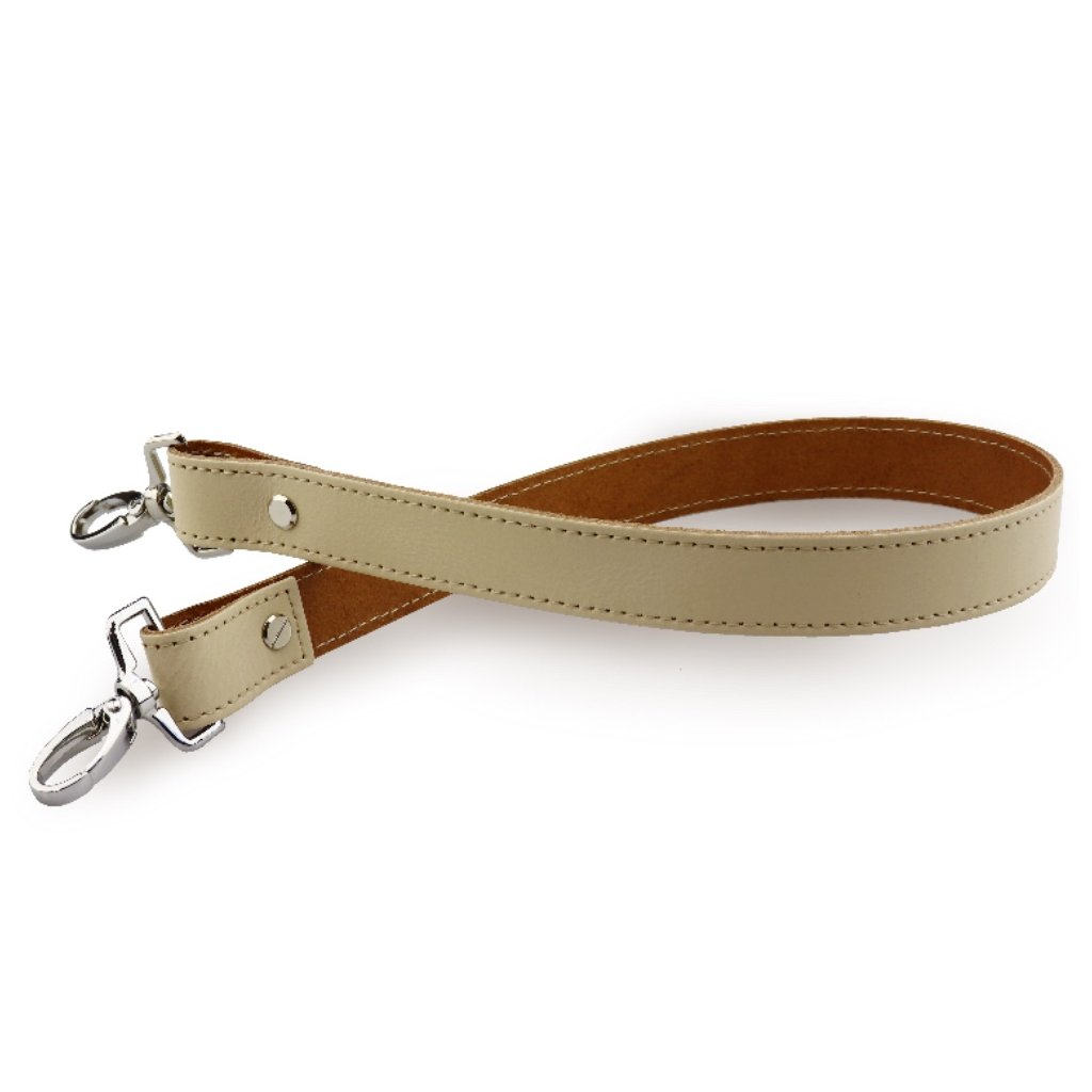 Kožený popruh prošívaný 58 cm, š. 2,5 cm, krémový, karabina s hranatým průvlekem, nikl