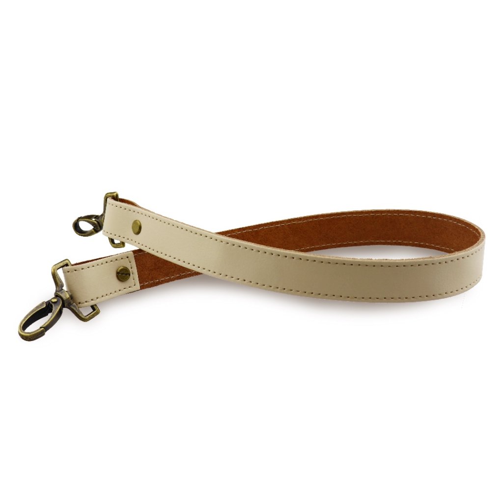 Kožený popruh prošívaný 58 cm, š. 2,5 cm, krémový, karabina s hranatým průvlekem, staromosaz