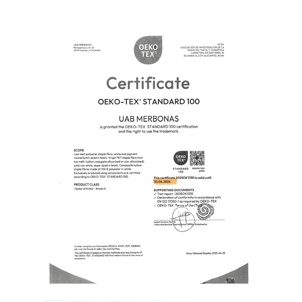 The product has received an international certificate of safety and suitability for children under 3 years of age. Öko-Tex standard 100 certificate.
