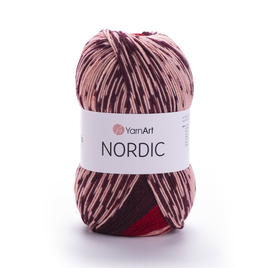 YarnNordic(Yarn Art) is a blended yarn of acrylic and wool with an intelligent pattern. The yarn is dyed to form multi-coloured stripes that fit together to form a pattern.