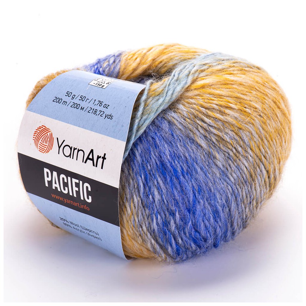 YarnPacificis an original acrylic yarn with wool content. It is two twisted threads, the first carries the main colour, the second is coloured in the style of melanic batik, the colours blend beautifully and the resulting knit is very interestingly coloured.