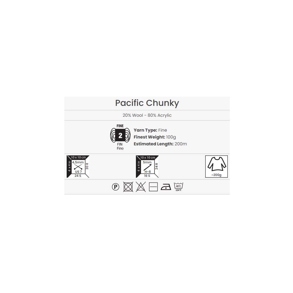 YarnPacific Chunkyis the thicker sister of Pacific, the original wool-blend acrylic yarn. It is two twisted yarns, where the first carries the main colour, the second is dyed in the style of melanic batik, the colours blend beautifully and the resulting knit is very interestingly coloured.