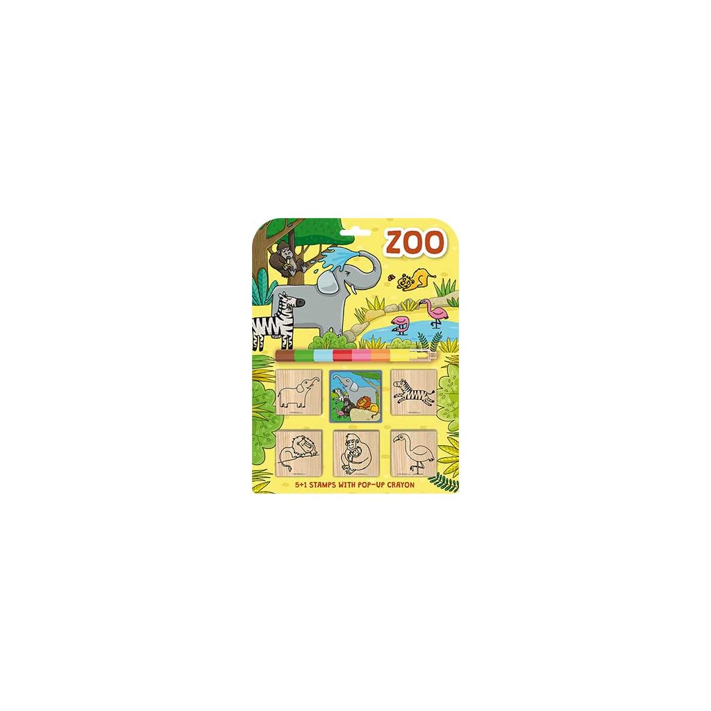 The set includes 5 easy-to-grip wooden stamps, a coloured cushion with your favourite motif and a seven-colour folding wax pen for colouring.