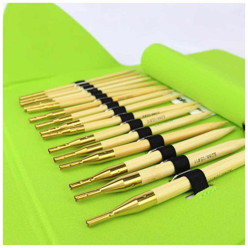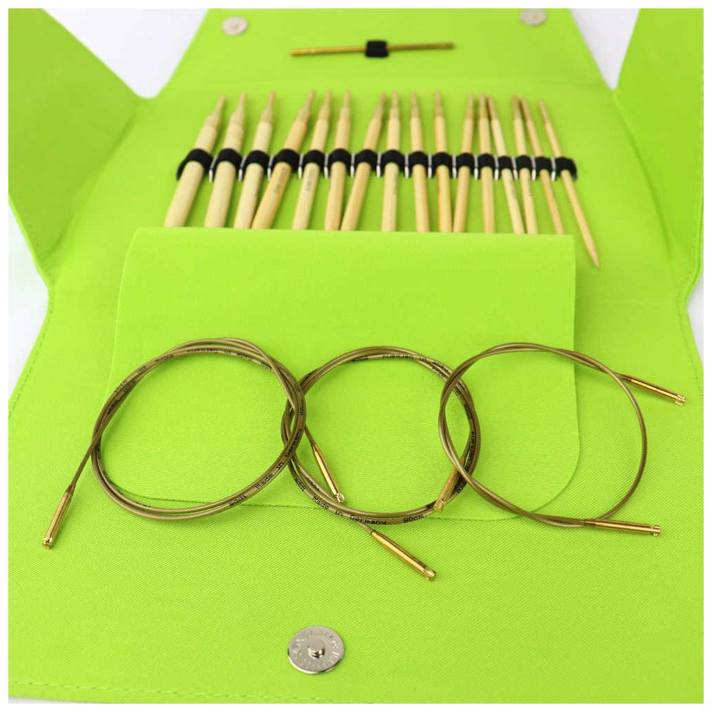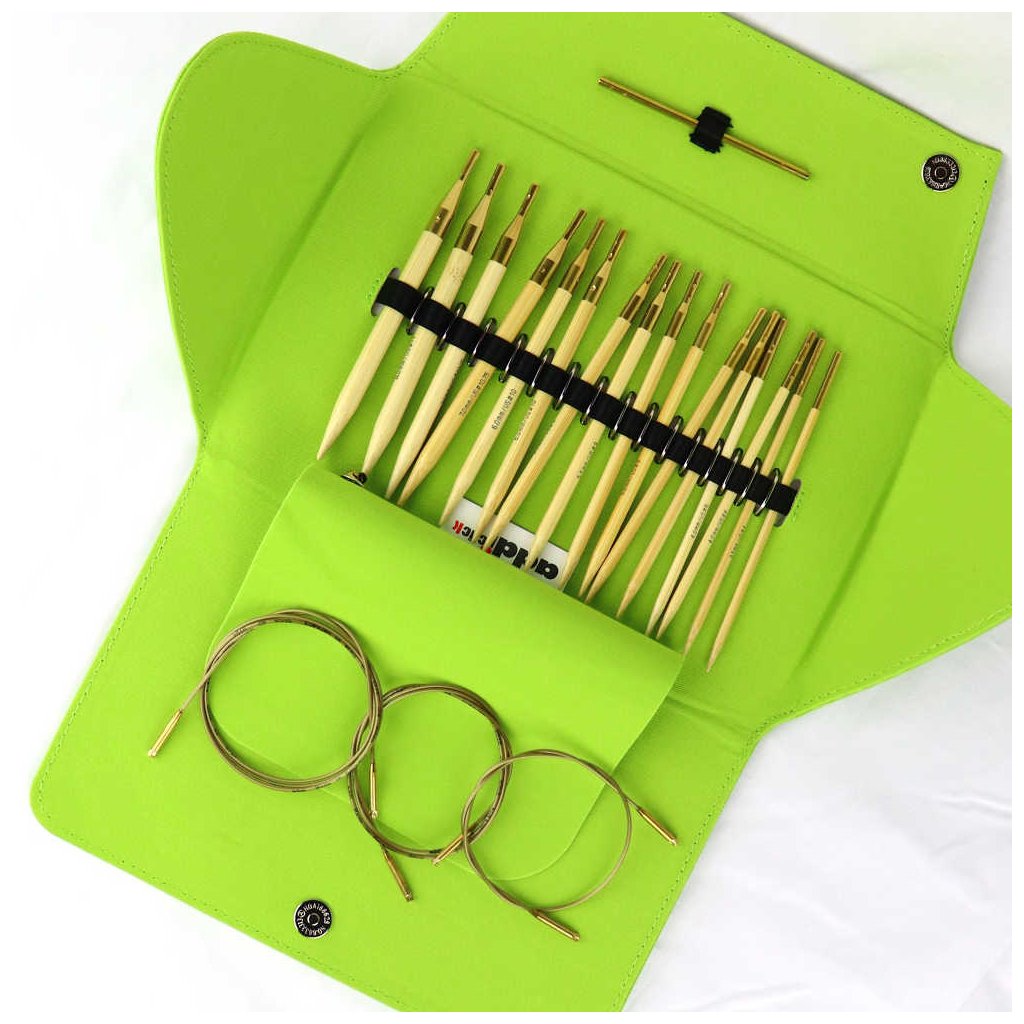 Addi Click luxury set of interchangeable bamboo needlesis storedin a practical green case. The set contains 8 pairs of needles, which are fitted on the other sidesnap-in mechanismfor connection to the Addi Click range of interchangeable cables. Each needle has its own place in the housing.