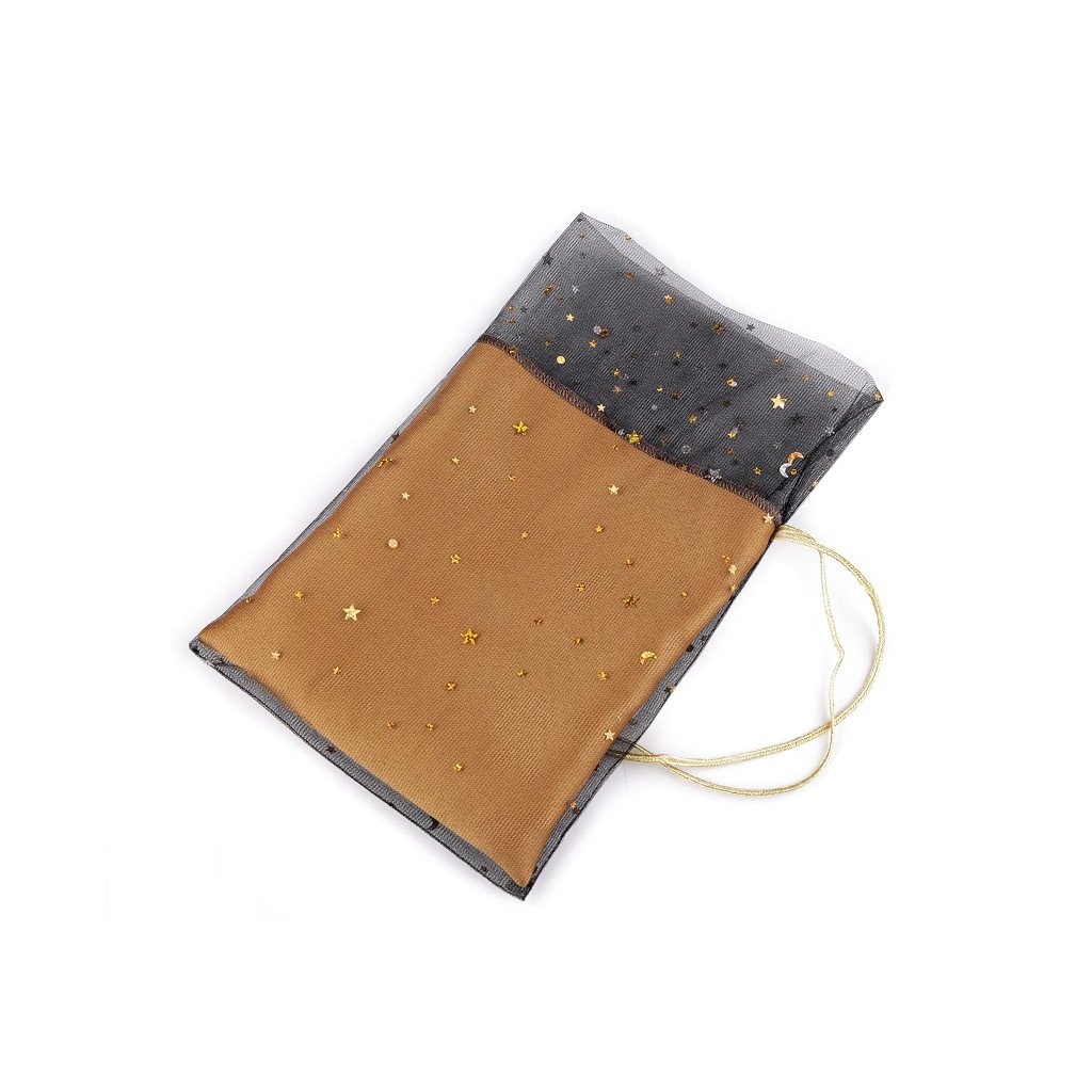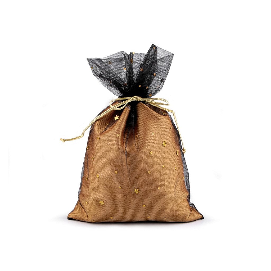 Christmas gift bag tulle 19x27 cm with stars, golden brown with golden stars.