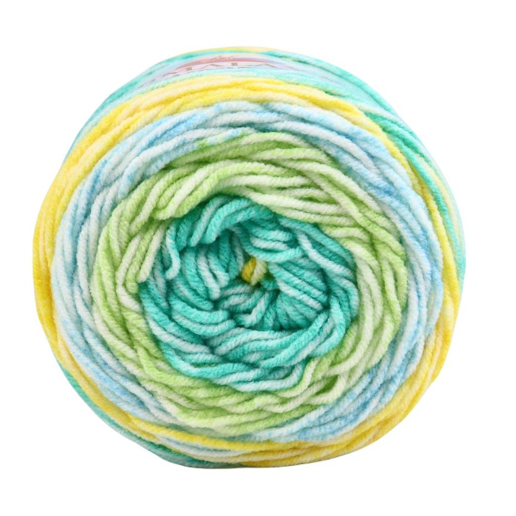 Multi-coloured acrylic yarn with cheerful and playful tones. The yarn has colour gradients - stripes with a subtle batik effect.