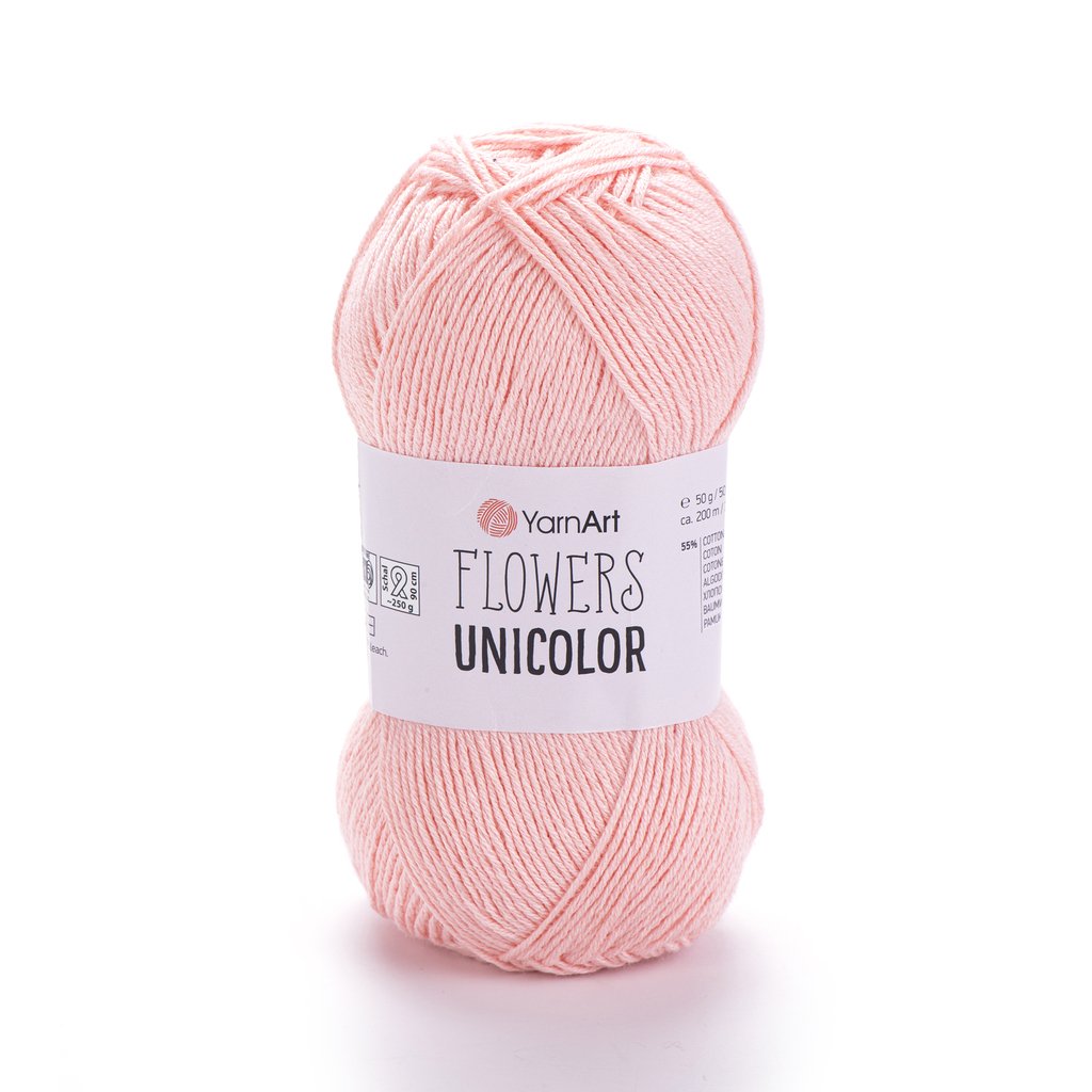 Jednobarevná příze Flowers Unicolor má stejné složení bavlny a polyakrylu jako příze Flowers, Flowers Vivid.