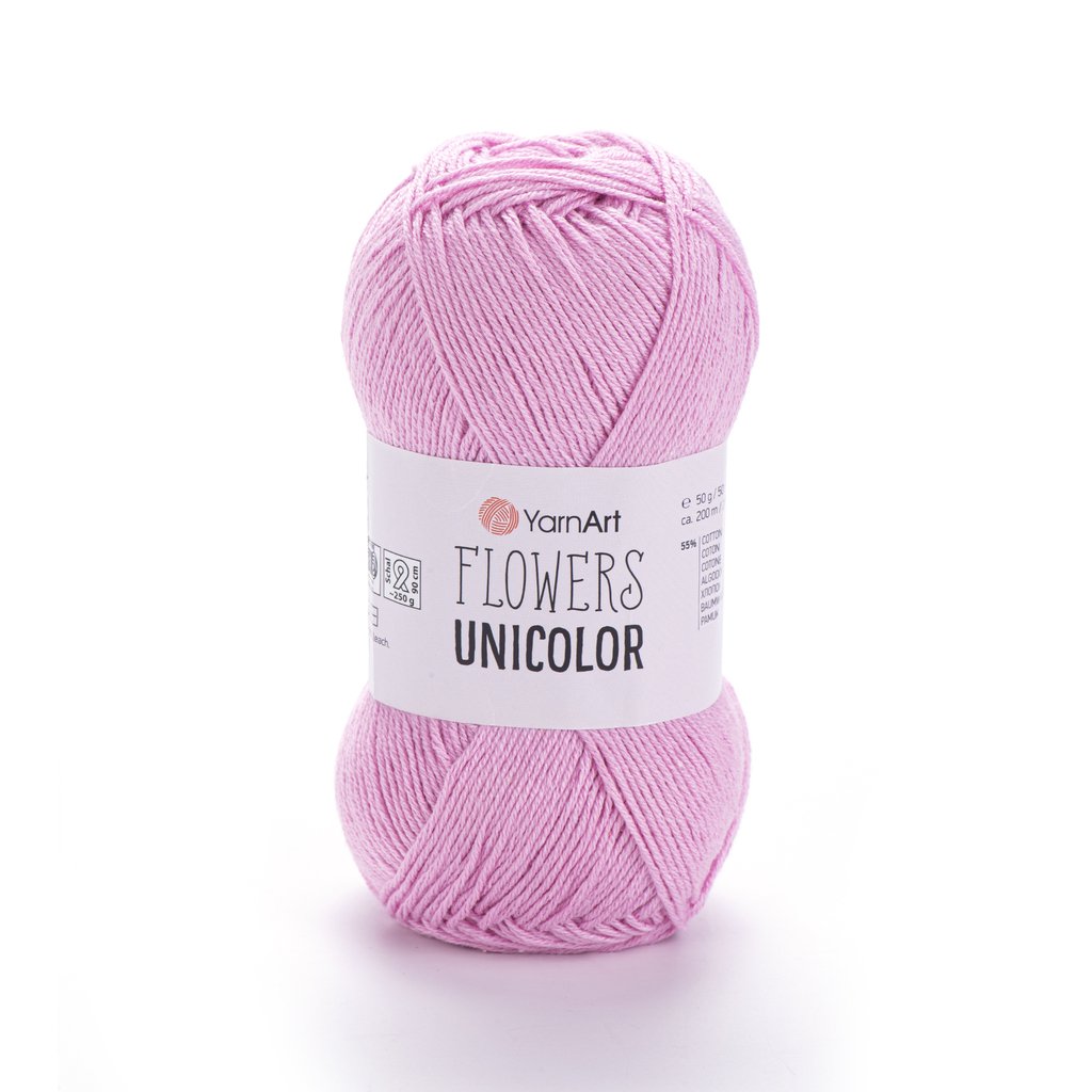 Jednobarevná příze Flowers Unicolor má stejné složení bavlny a polyakrylu jako příze Flowers, Flowers Vivid.