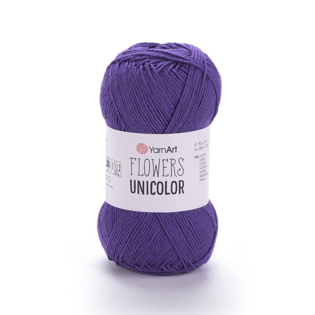 Jednobarevná příze Flowers Unicolor má stejné složení bavlny a polyakrylu jako příze Flowers, Flowers Vivid.