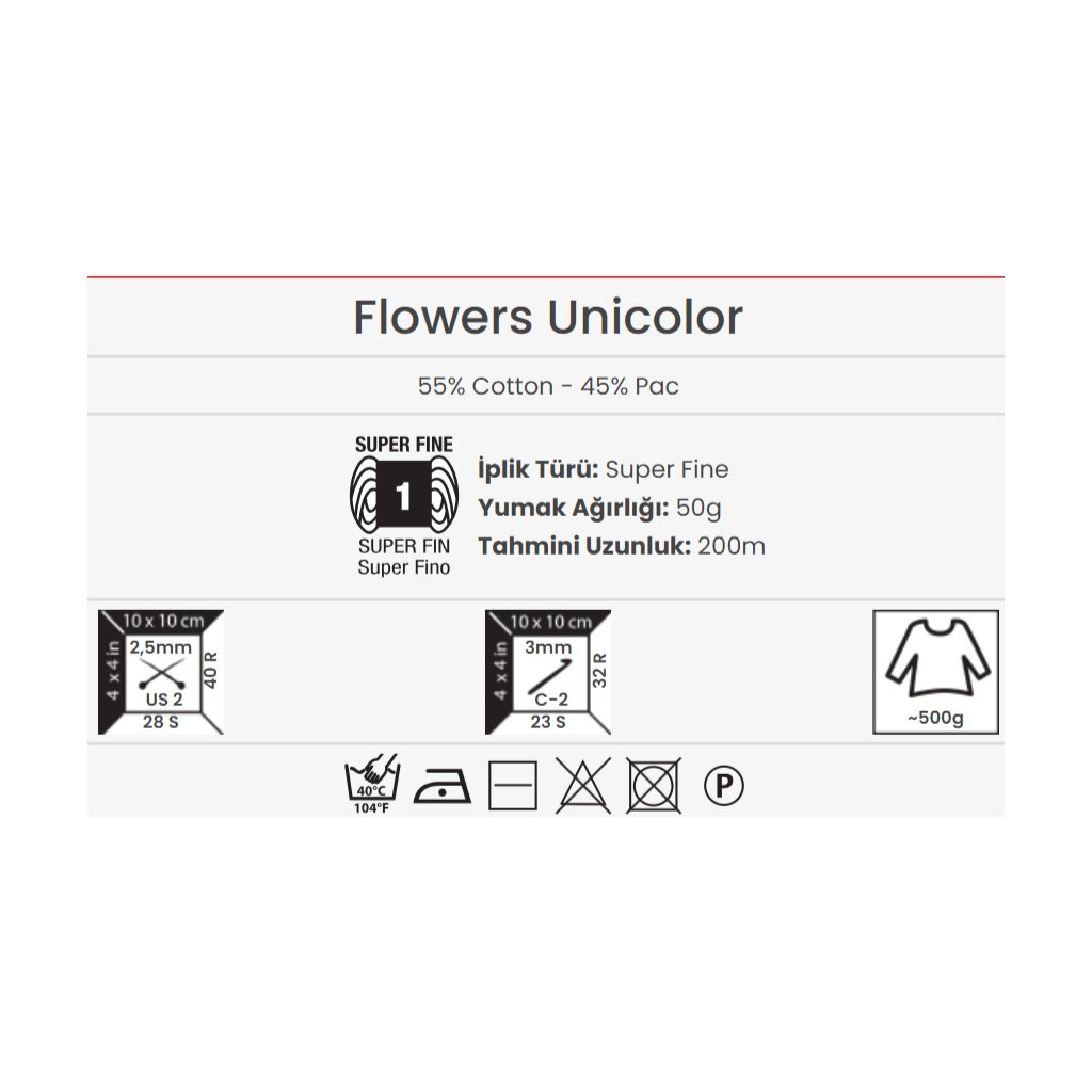 Jednobarevná příze Flowers Unicolor má stejné složení bavlny a polyakrylu jako příze Flowers, Flowers Vivid.