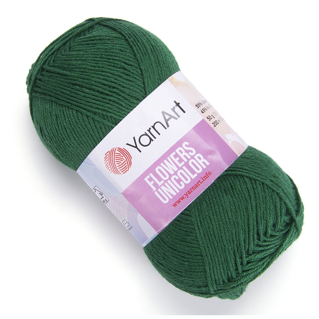 Jednobarevná příze Flowers Unicolor má stejné složení bavlny a polyakrylu jako příze Flowers, Flowers Vivid.