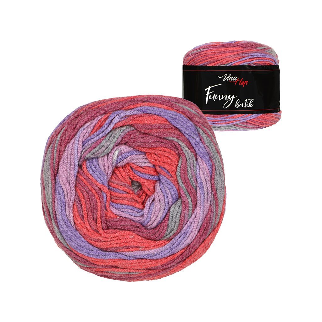 Příze Funny batik je vhodná pro různé druhy ručního pletení a háčkování a umožňuje vytváření originálních vzorů a efektů - barvy mají delší barevné přechody a vytváří se pruhy.
