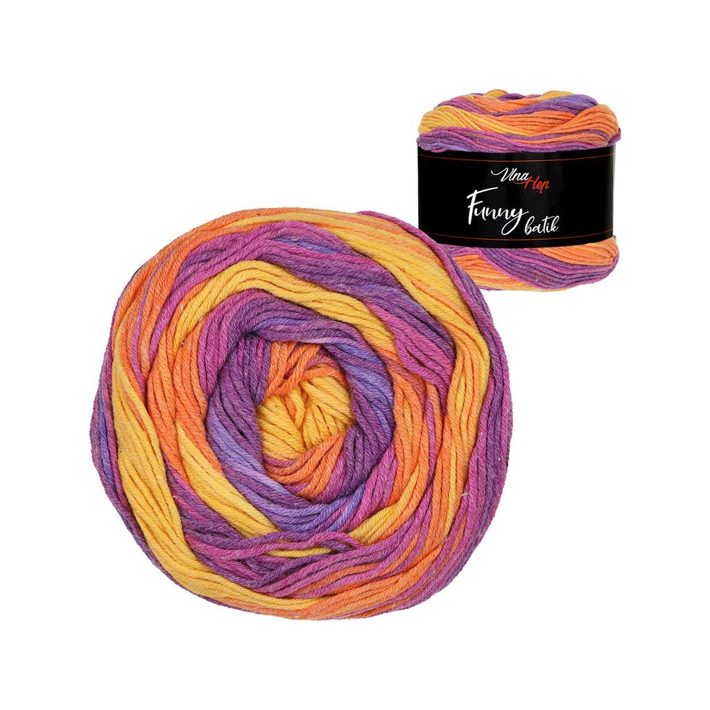Příze Funny batik je vhodná pro různé druhy ručního pletení a háčkování a umožňuje vytváření originálních vzorů a efektů - barvy mají delší barevné přechody a vytváří se pruhy.