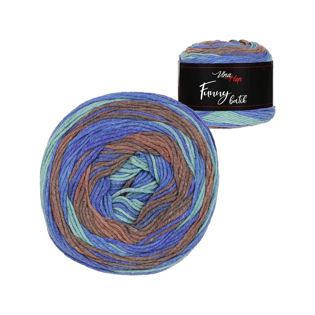 Příze Funny batik je vhodná pro různé druhy ručního pletení a háčkování a umožňuje vytváření originálních vzorů a efektů - barvy mají delší barevné přechody a vytváří se pruhy.