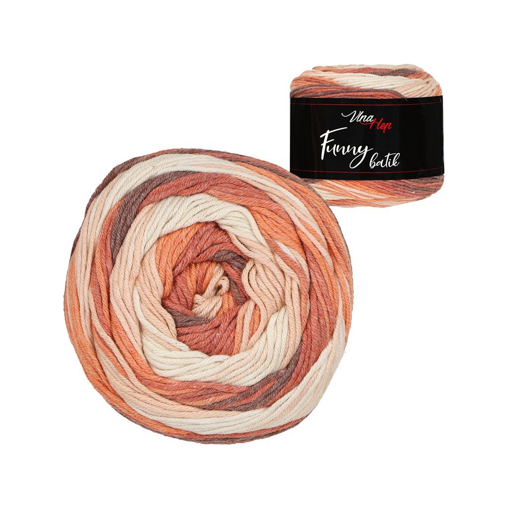 Příze Funny batik je vhodná pro různé druhy ručního pletení a háčkování a umožňuje vytváření originálních vzorů a efektů - barvy mají delší barevné přechody a vytváří se pruhy.