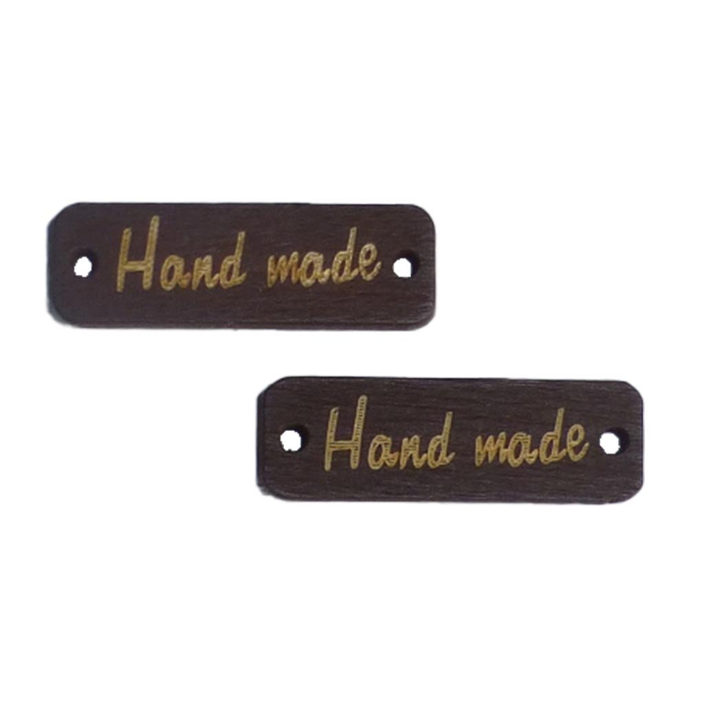 Dřevěný obdélníkový knoflík. Nápis Hand made.
