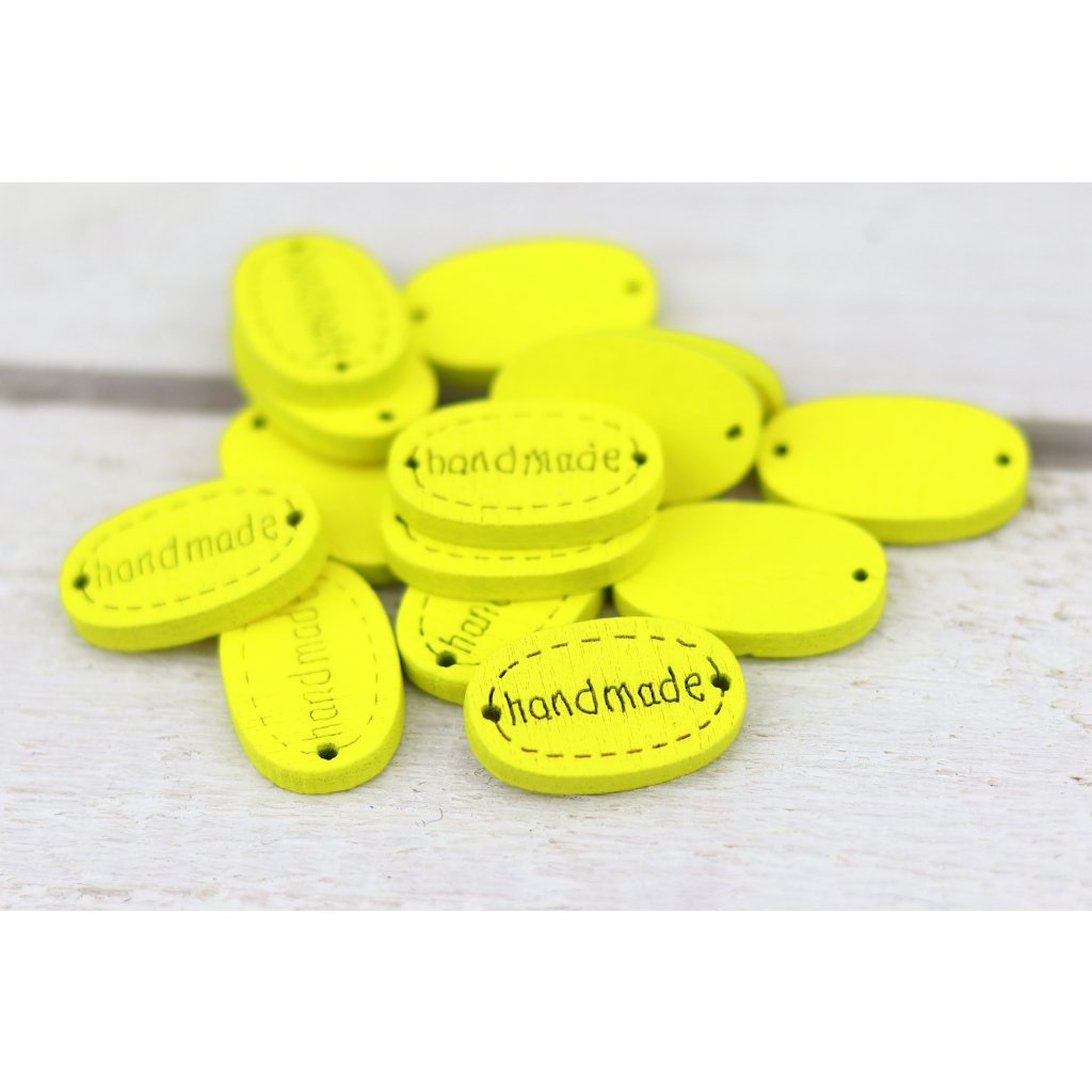 Dřevěný oválný knoflík (8 x 35 mm) s nápisem Handmade.