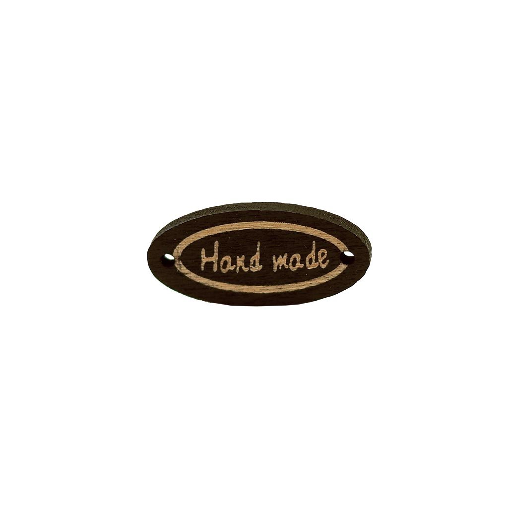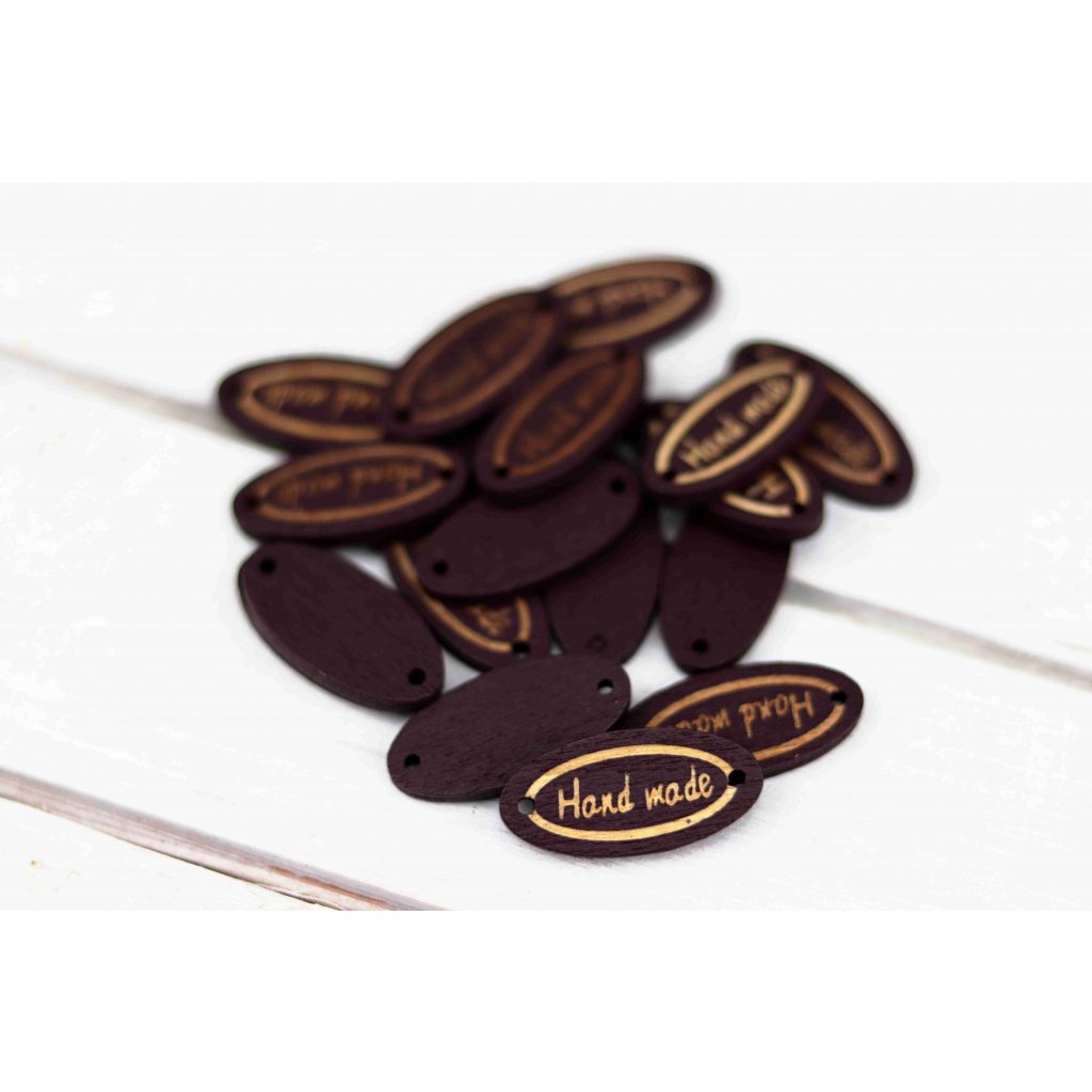 Dřevěný oválný knoflík (8 x 35 mm) s nápisem Handmade.