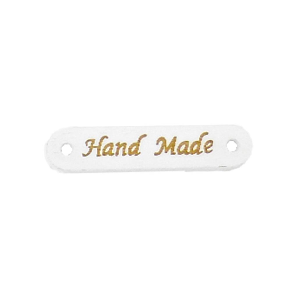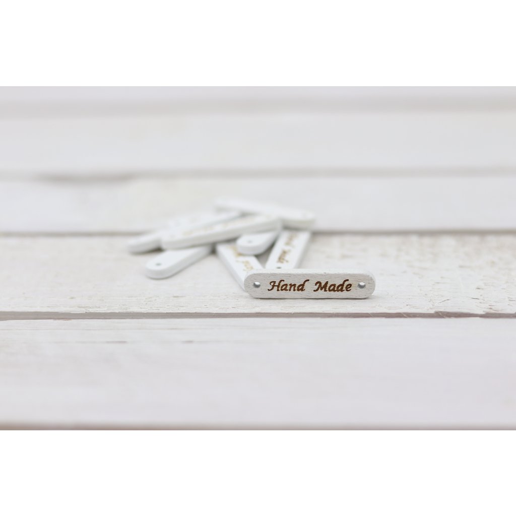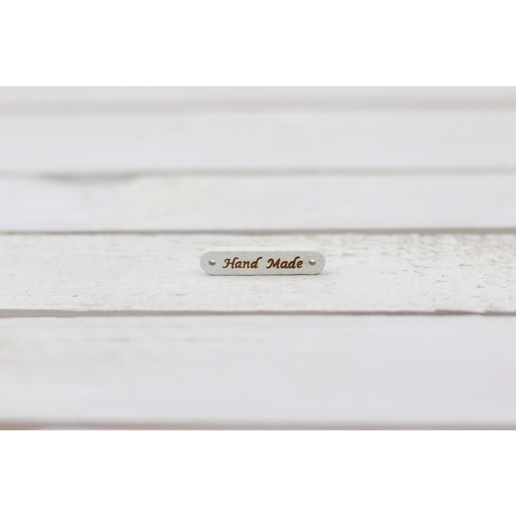 Dřevěný obdélníkový knoflík. Velikost 30x10 mm. Barva hnědá. Nápis Hand made.