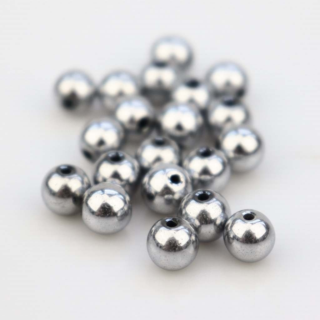 Tyto korálky jsou vyrobeny ze syntetického nemagnetického hematitu. Hematit je v leštěné podobě dokonale černý hladký minerál s nádherně lesklým povrchem. Pokovením získává hematit ještě lesklejší povrch.
