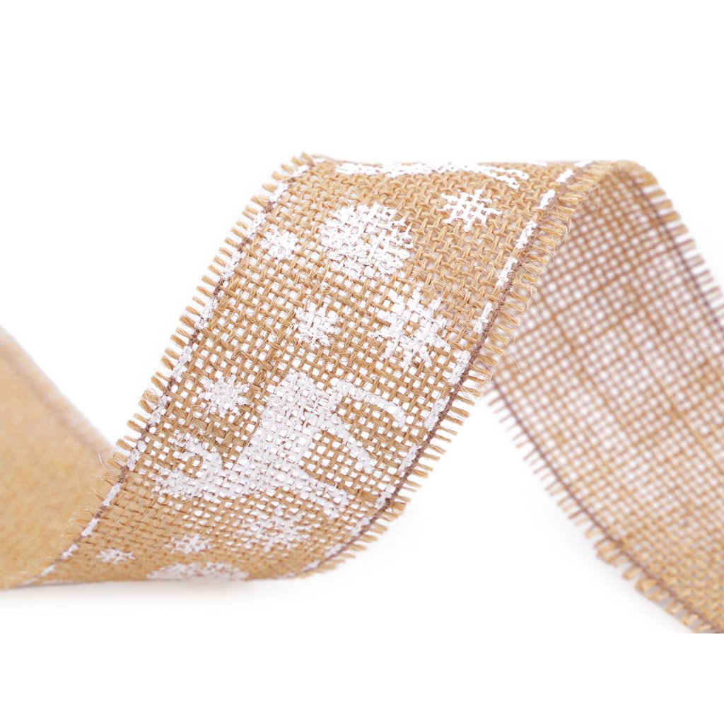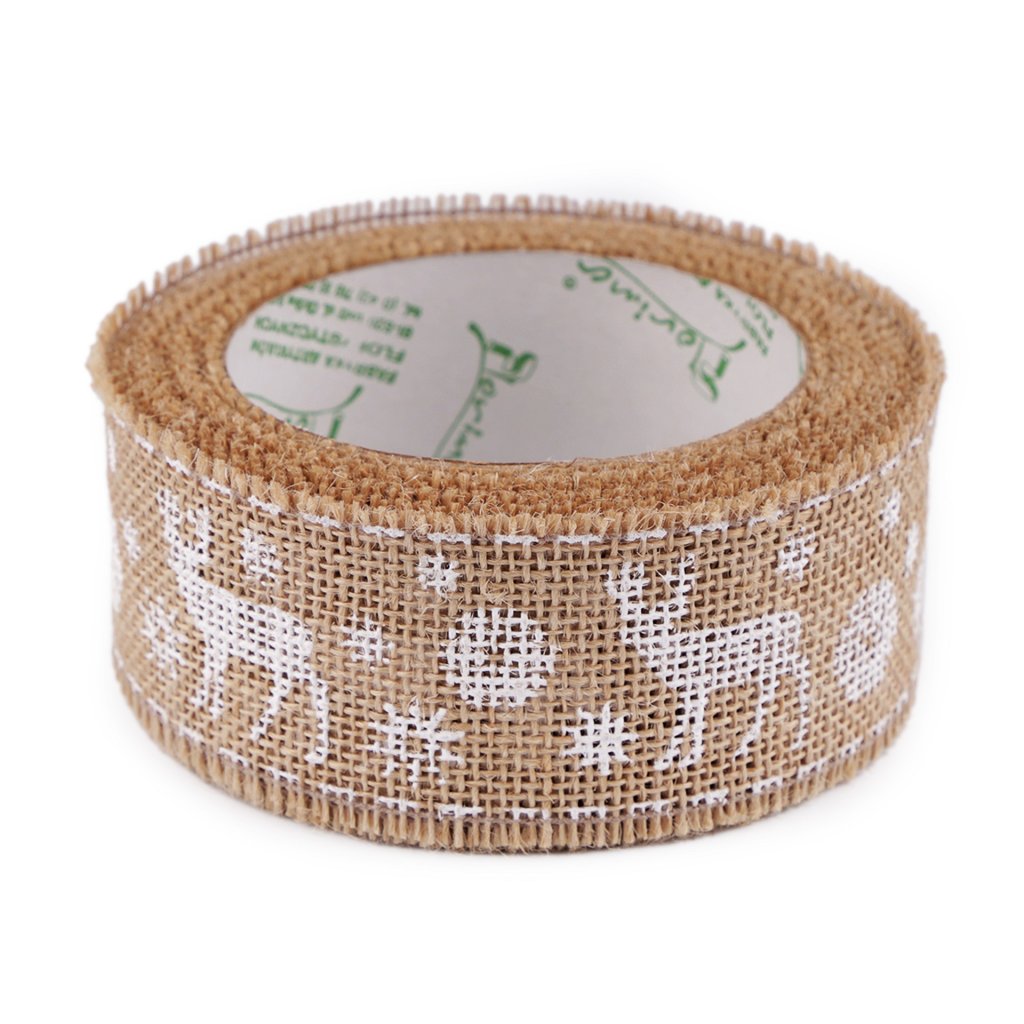 Vánoční jutová stuha má přírodní vzhled. Najdete na ní jednobarevný potisk s motivem jelenů a sněhových vloček. Na okrajích je stuha jemně vytřepená, ale díky prošití je pevná, nepáře se. Potisk je jednostranný.