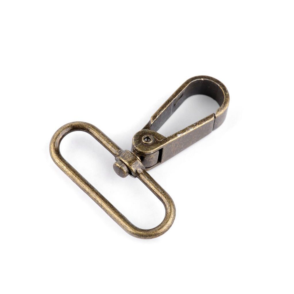 Kovová karabina je otočná. Využijete ji k výrobě klíčenek, vodítek nebo k připevnění popruhů na tašky a kabelky.