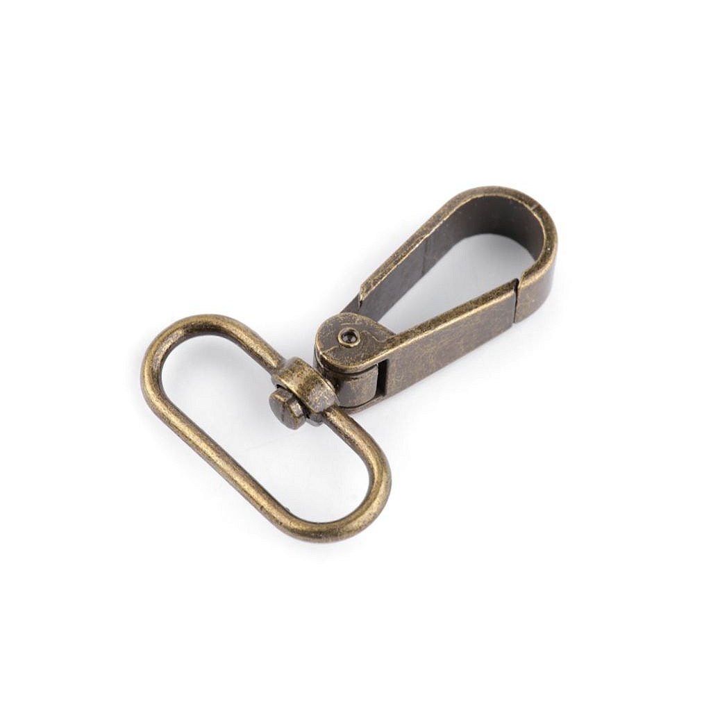 Kovová karabina je otočná. Využijete ji k výrobě klíčenek, vodítek nebo k připevnění popruhů na tašky a kabelky.