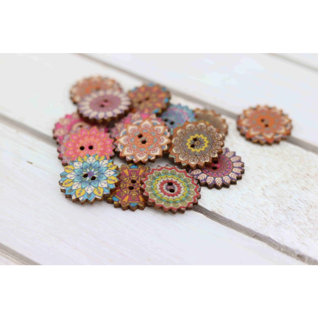 Knoflík je barevny s ornamenty. Knoflík je vroubkovaný vhodný na ozdobení výrobků.
