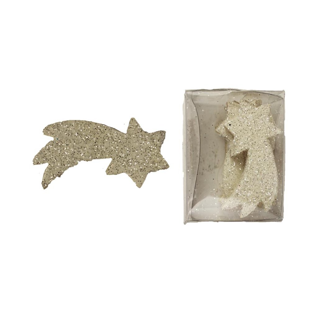 Dřevěné komety ve bílé barvě se třpytkami využijete jako dekoraci na vánoční stromeček nebo k dozdobení věnců, svícnů, girland aj.
