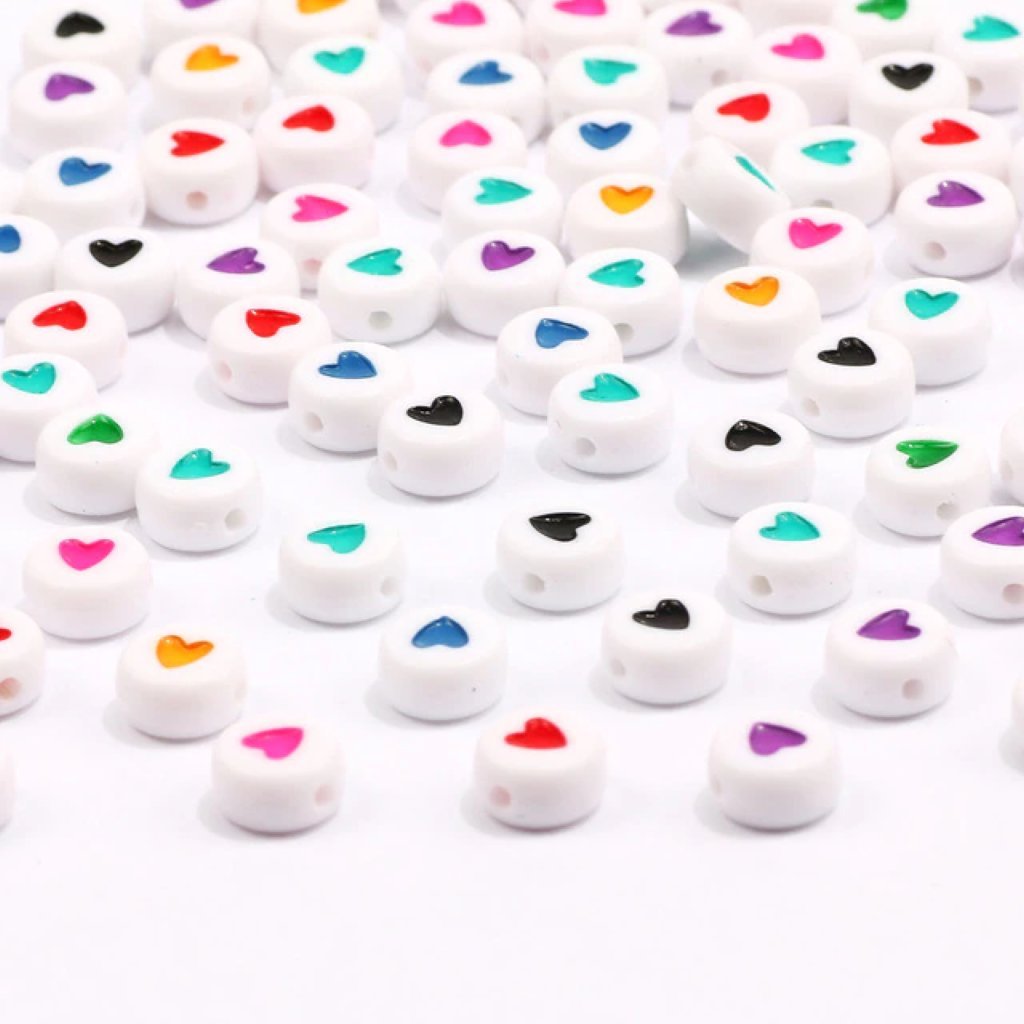 Korálky - bílé lentilky se srdíčky z akrylové hmoty o průměru 7 mm, výšce 4 mm a průvlekem 1 mm. Korálek je bílý a srdce jsou barevná - náhodný mix barev.