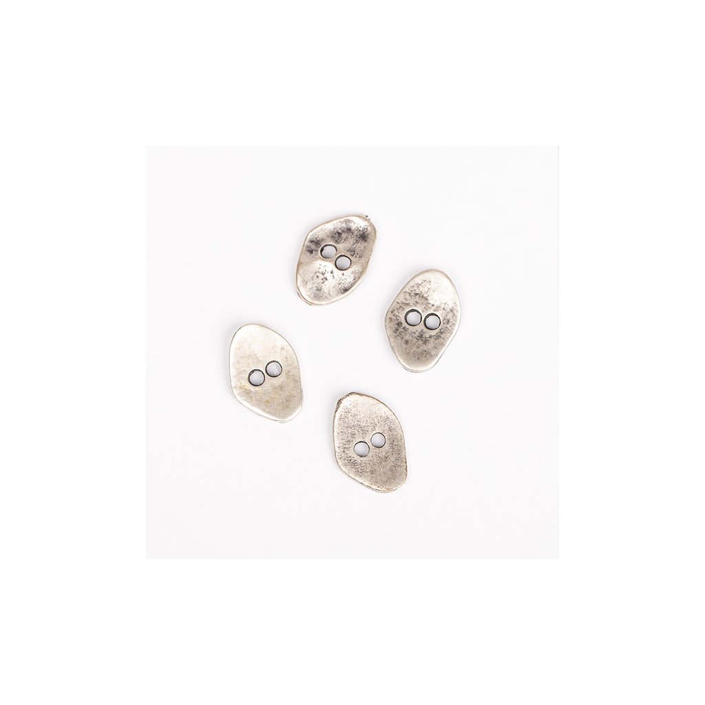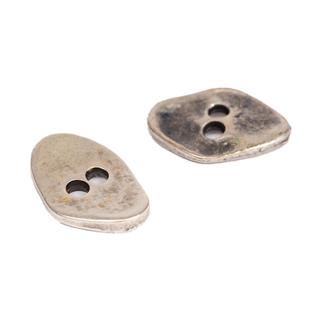 Asymetrické knoflíky stříbrné barvy jsou odlité pod tlakem ze zinku.