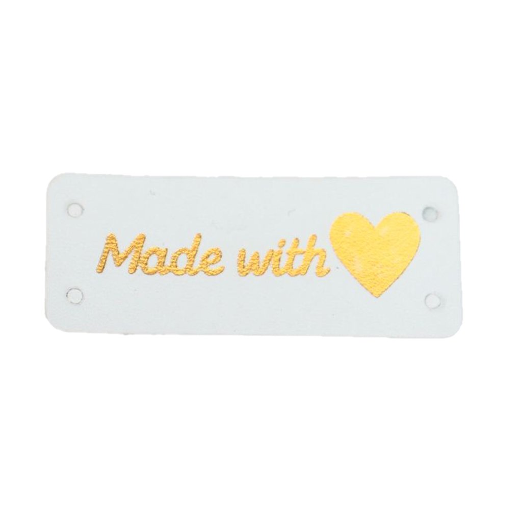 Koženková cedulka s hnědým nápisem Made with ♥ je vhodná jako štítek na vlastnoručně vyráběné produkty.